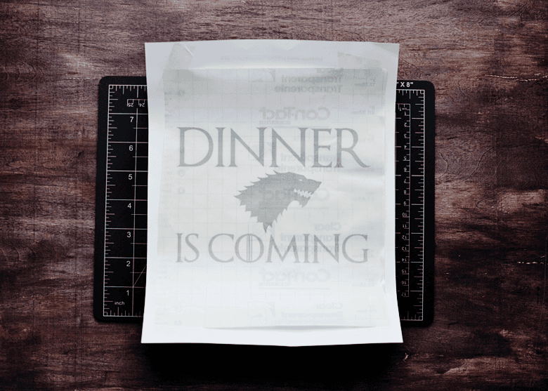 I created my own design in Photoshop using the Game of Thrones font. Then I taped a piece of contact paper (liner side up) to a piece of regular printer paper, fed it into my printer, and printed the design out. Be careful because the ink will smudge VERY easily if you don’t let it dry for a while.