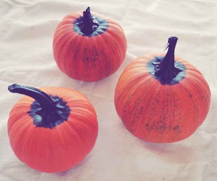 Paint the stems and around the base black (my pumpkins look a little sick here, they were perfectly orange last week but I think they’re getting too ripe)