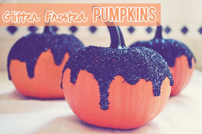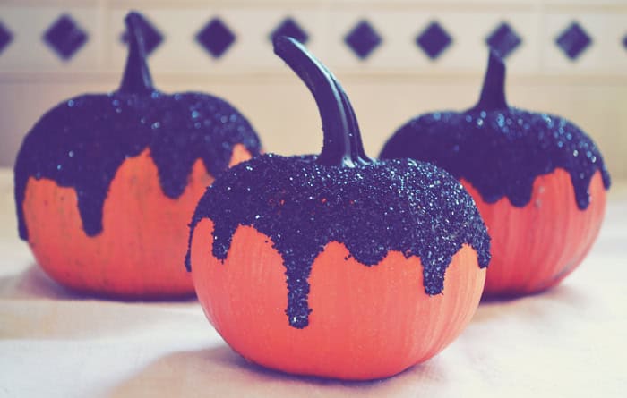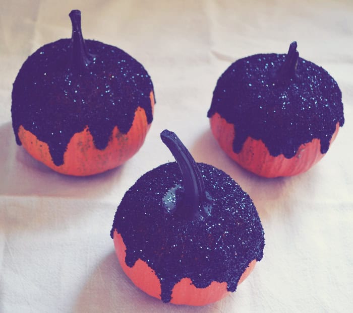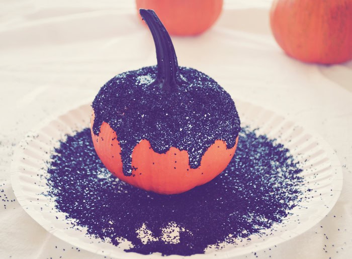 Dump glitter on the pumpkin, make sure to tip upside down to get the under side of the drips.