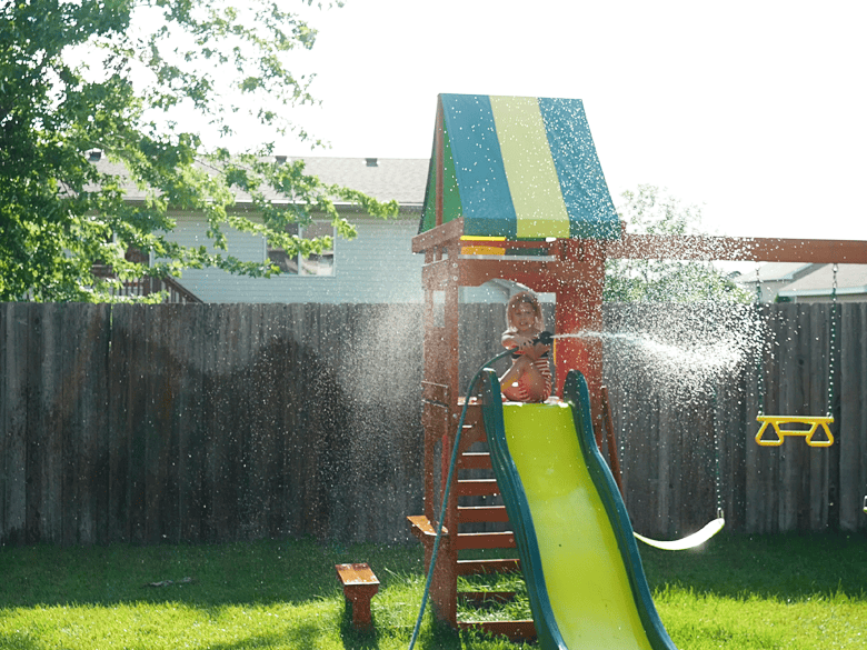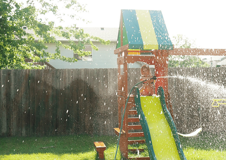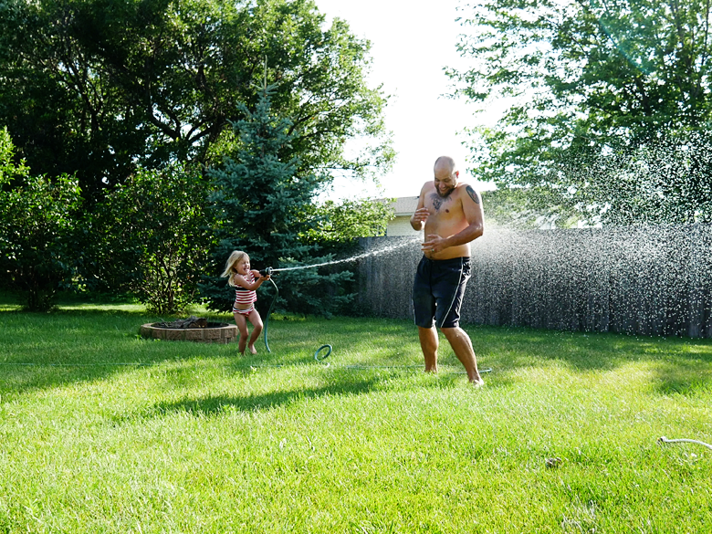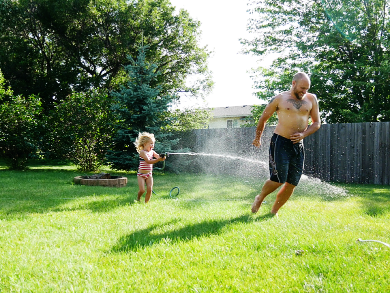 There’s something slightly terrifying about letting a crazy 3 year old loose with a hose in her hands. My husband experienced this terror firsthand, brave guy. The joy on her face is worth getting pelted with a little water 😉