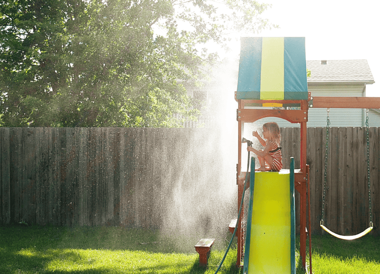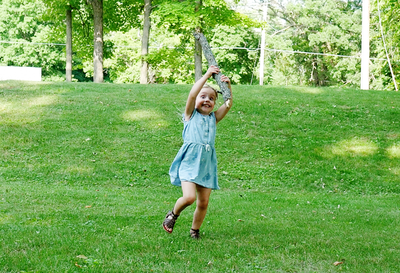Luckily, I don’t even have to leave our backyard to make the most of the rest of our summer. In fact, some of the most fun our family has together happens in the backyard. We bonfire, we play on the swing set, we pull out the redneck blow up pool and cool off, heck we even have fun giving Bean the hose and just letting her go wild.