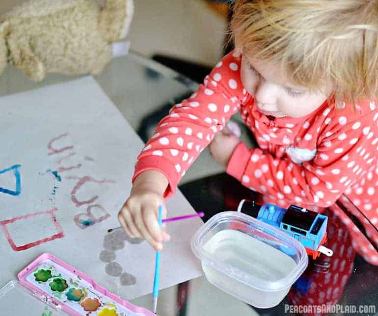 I adore painting with Bean. I never want to force my hobbies onto her, but it makes me smile whenever she takes a liking to one. I had the best proud Mommy moment when she asked me to spell her name. As I was painting it, she pronounced each letter. In the end I asked her “What does that spell?” and she proudly shouted out, “Brynn!” Pretty good for a 2 1/2 year old ๐ And yes, she has a mad case of bed head. It’s her trademark.